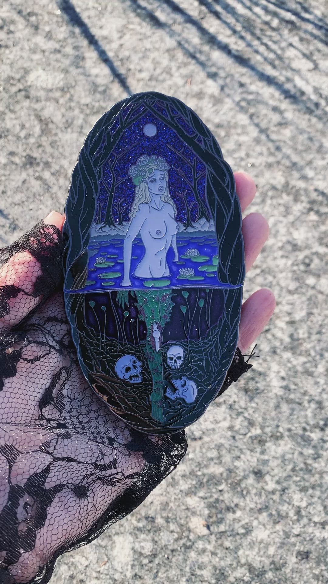 A monster of a pin at 5" tall, the Rusalka will command your attention and collection. The "Nocturne" edition features glitter, glow-in-the-dark, and pearlescent details to fascinate. Soft enamel + epoxy, limited edition of 99.